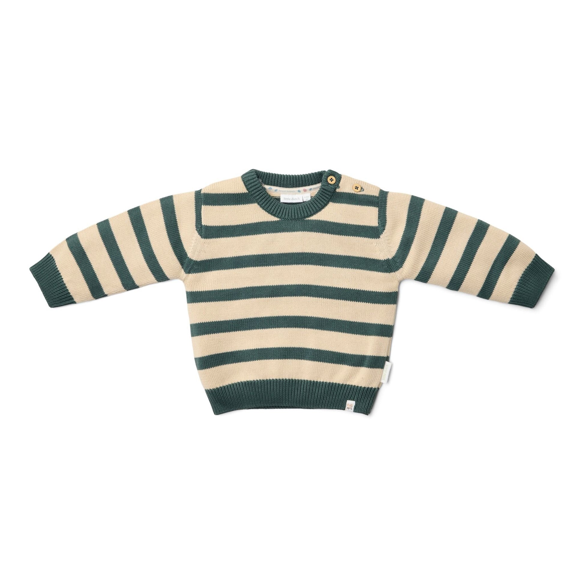 Deze warme gebreide trui combineert stijl en gemak met een knipoog. De tweekleurige strepen in balsemgroen en crème zorgen voor een coole look, terwijl de handige knoopjes in de kraag het aankleden net dat beetje makkelijker maken (voor de kleine én de ouders!). Gemaakt van zacht, biologisch katoen en natuurlijk Oeko-Tex gecertificeerd - want comfort en duurzaamheid gaan hand in hand. Perfect voor kleine avonturiers die graag zowel warm als stijlvol willen zijn! Verkrijgbaar in de maten 74, 80, 86 en 92.