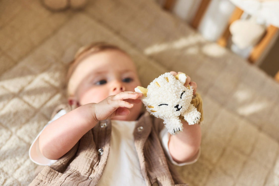 Deze schattige polsrammelaar is het ideale speeltje voor je kleintje. Het bouclé katje heeft lieve gele streepjes en maakt een vrolijk geluidje bij elke beweging. De olive green polsband maakt het eenvoudig om de rammelaar vast te maken aan de pols van je baby. Zo heeft je kleintje altijd zijn nieuwe favoriete vriendje binnen handbereik! Uren speelplezier gegarandeerd!