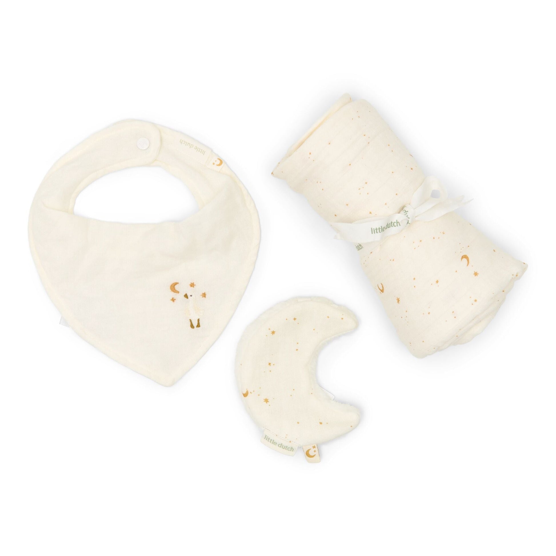 Geef het perfecte cadeau met deze luxe gift box! De set bevat 3 must-have items: een hydrofiele doek en speendoekje met de schattige Moon & Stars print, plus een bandana in een rustige Soft White kleur met schattig borduursel. Gemaakt van muslin, pre-washed en crinkled, zijn deze doekjes en bandana heerlijk zacht en super absorberend. De bijpassende box is niet alleen perfect voor het cadeau, maar ook ideaal om herinneringen van je kleintje in te bewaren (want we weten allemaal dat die eerste slofjes ergens bewaard moeten worden).