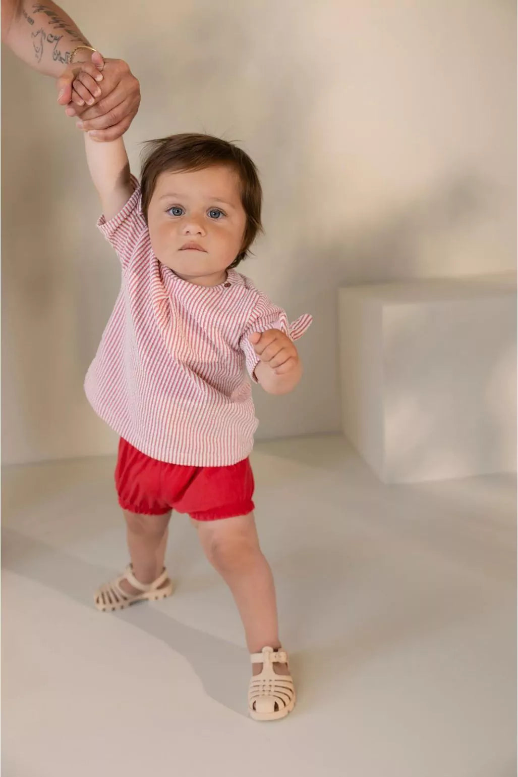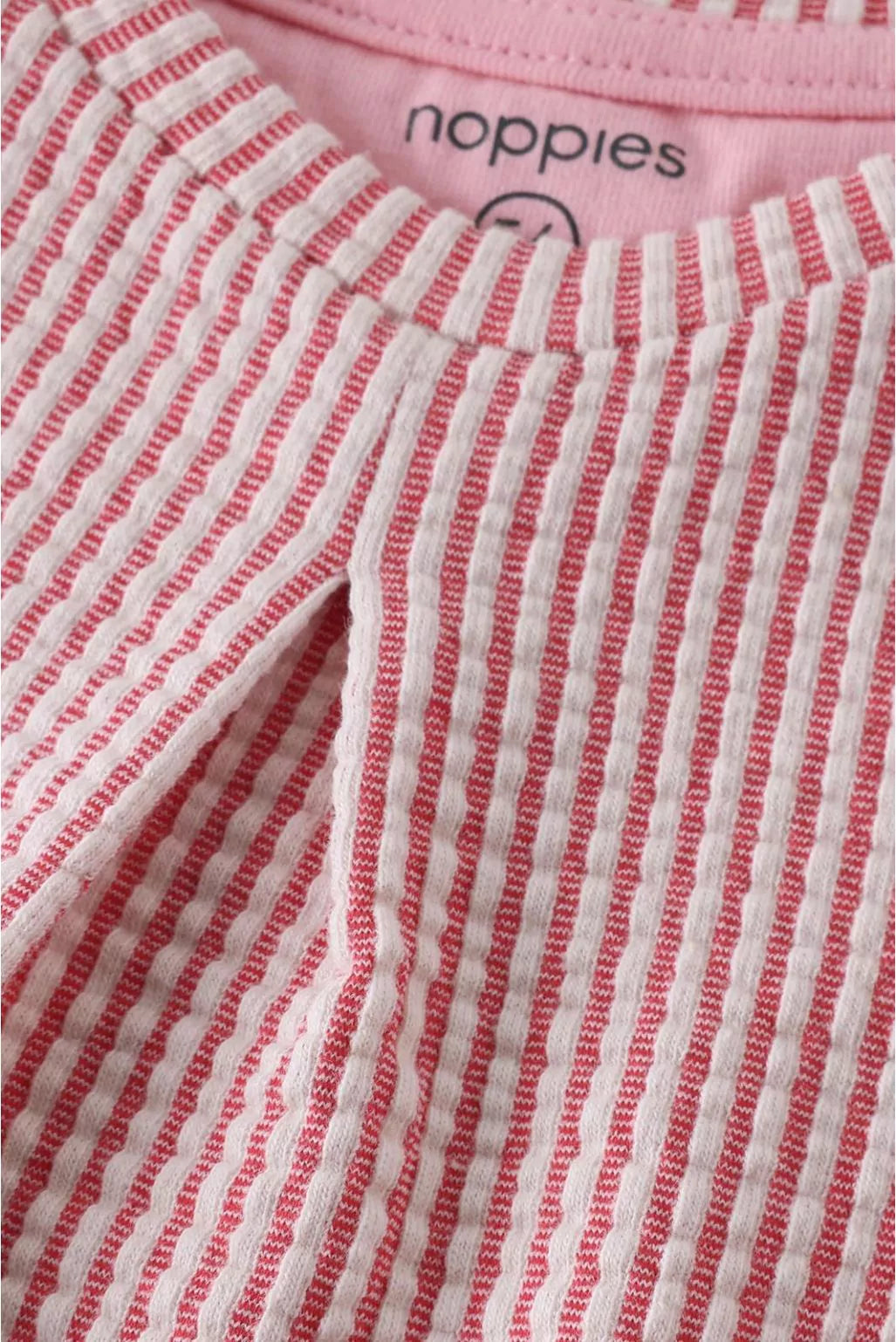 Dit meisjes T-shirt van Noppies is een zomerse musthave met een verfijnde twist. De seersucker streepjesstof voelt licht en luchtig aan, terwijl het kleine beetje stretch zorgt voor extra draagcomfort. De strikjes aan de mouwtjes geven het shirt een speelse uitstraling, perfect voor jouw kleine dame. De ronde hals is voorzien van een drukknoopje, wat het aan- en uitkleden net wat makkelijker maakt – handig voor drukke ochtenden en beweeglijke momenten. Het T-shirt is gemaakt met biologisch katoen. Combineer het met een rokje, shortje of jeans voor een frisse, zomerse look. Een stijlvol en comfortabel item dat elke outfit opvrolijkt. Voeg deze top vandaag nog toe aan haar garderobe!