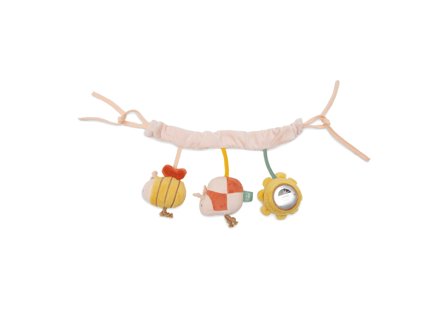 Deze vrolijke wagenspanner uit het Pretty Picnic thema is het perfecte speeltje voor onderweg. Het zonnetje heeft een spiegeltje waarin je kleintje zichzelf kan ontdekken, het bijtje maakt een knisperend geluid en het lieveheersbeestje heeft een zacht belletje binnenin. Samen zorgen ze voor eindeloos kijk- en speelplezier onderweg!